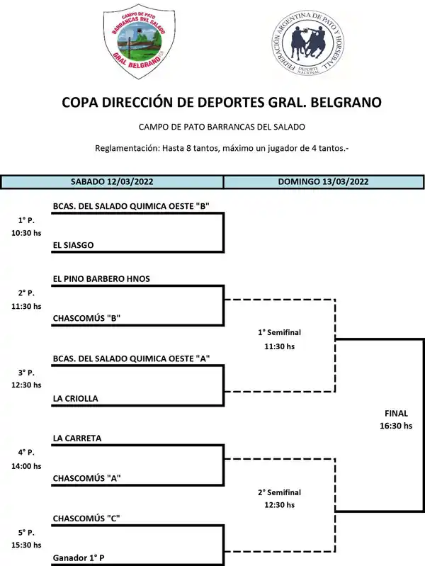 Este fin de semana, 12 y 13 de marzo, se llevará a cabo la Copa Dirección de Deportes en General Belgrano en el campo de Pato de Barrancas del Salado en Ruta 29 Km 78 de Gral. Belgrano, Prov. de Bs As.