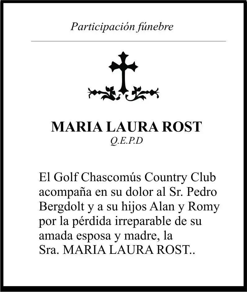 El Golf Chascomús Country Club acompaña en su dolor al Sr. Pedro Bergdolt y a su hijos Alan y Romy por la pérdida irreparable de su amada esposa y madre, la Sra. MARIA LAURA ROST.