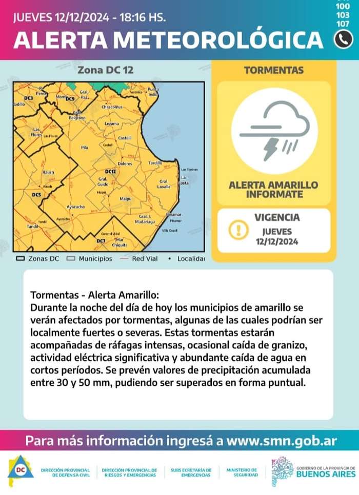 Las áreas serán afectadas por tormentas, algunas de las cuales podrían ser localmente fuertes o severas. Estas estarán acompañadas de ráfagas intensas, ocasional caída de granizo, actividad eléctrica significativa y abundante caída de agua en cortos períodos. Se prevén valores de precipitación acumulada entre 30 y 50 milímetros, pudiendo ser superados en forma puntual.