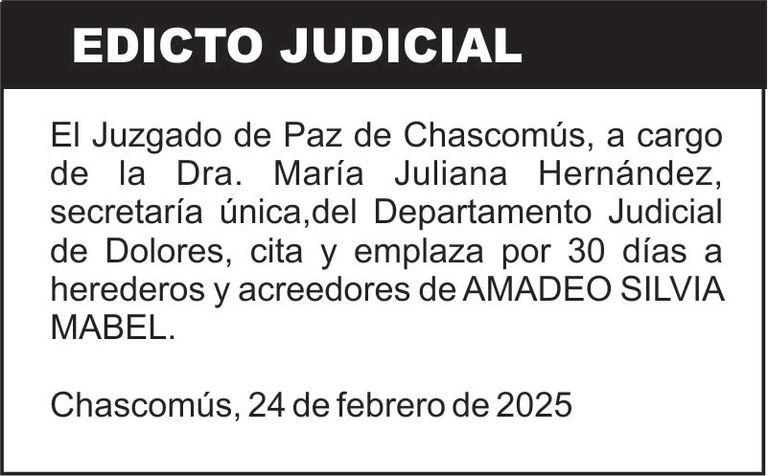 El Juzgado de Paz de Chascomús, a cargo de la Dra. María Juliana Hernández, secretaría única,
