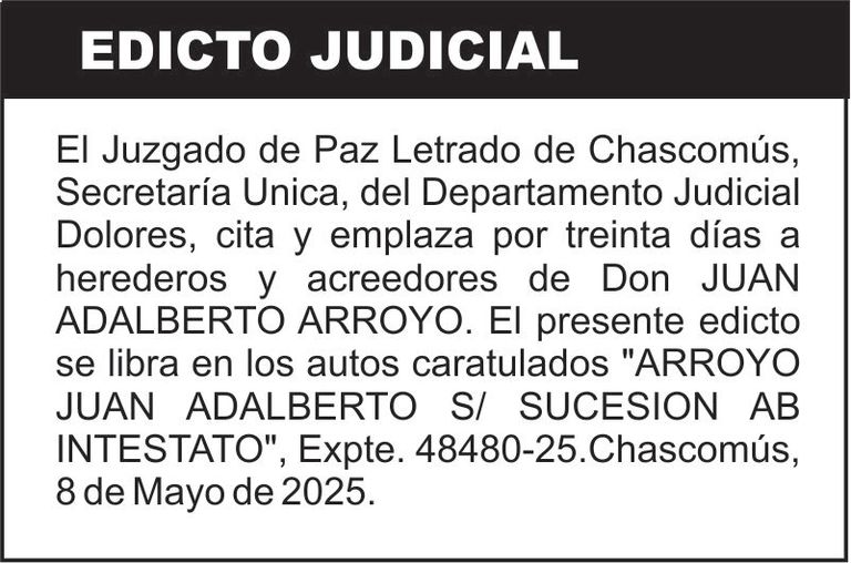 El Juzgado de Paz Letrado de Chascomús, Secretaría Unica, del Departamento Judicial Dolores, cita y emplaza por treinta días a herederos y acreedores de Don JUAN ADALBERTO ARROYO. El presente edicto se libra en los autos caratulados “ARROYO JUAN ADALBERTO S/ SUCESION AB INTESTATO”, Expte. 48480-25.