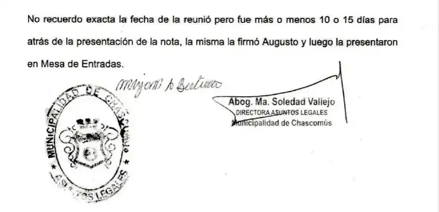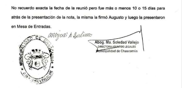 “Más tarde ratificó sus dichos a instancia de la secretaría de Asuntos Legales del municipio y añadió que la firma había sido estampada por Augusto Villa, concejal de Juntos”. “No recuerdo exacta la fecha de la reunió (SIC) pero fue más o menos 10 o 15 días para atrás de la presentación de la nota”, atestiguó, tras lo cual sostuvo que “la misma la firmó Augusto y luego la presentaron en mesa de entradas”.
