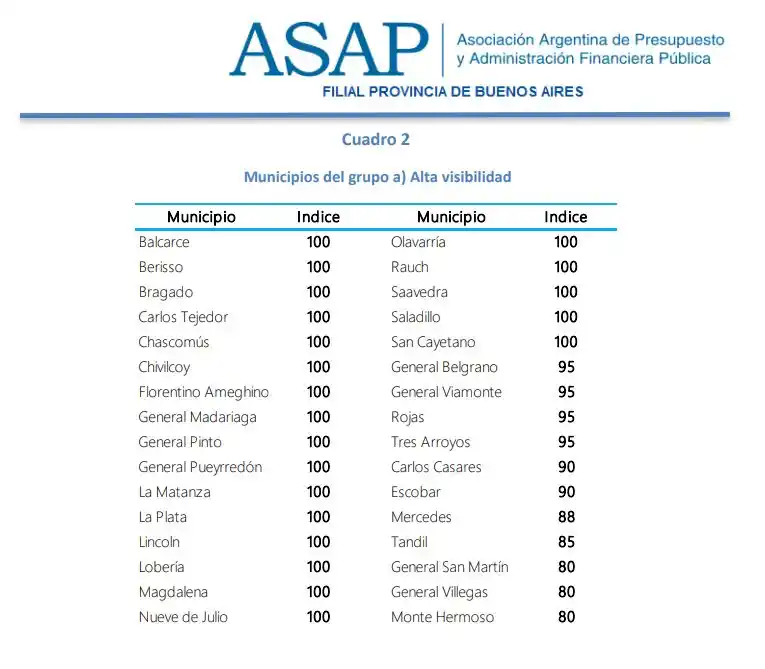 Entre las comunas con Alta Visibilidad –según detalla el informe elevado ayer por ASAP, se destacan los veintiún (21) municipios que presentan sin rezago la totalidad de la información fiscal relevada (Balcarce, Berisso, Bragado, Carlos Tejedor, Chascomús, Chivilcoy, Florentino Ameghino, General Madariaga, General Pinto, General Pueyrredón, La Matanza, La Plata, Lincoln, Lobería, Magdalena, Nueve de Julio, Olavarría, Rauch, Saavedra, Saladillo y San Cayetano). Completan el segmento de administraciones locales que demuestran este compromiso con la exposición de su desempeño fiscal: General Belgrano, General Viamonte, Rojas, Tres Arroyos, Carlos Casares, Escobar, Mercedes, Tandil, General San Martín, General Villegas y Monte Hermoso.