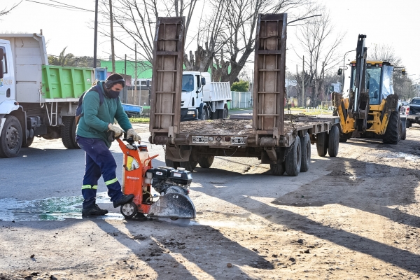 Personal de la Dirección de Vialidad trabaja en la reparación del pavimento en el cruce de la avenida Presidente Alfonsín con La Porteña.