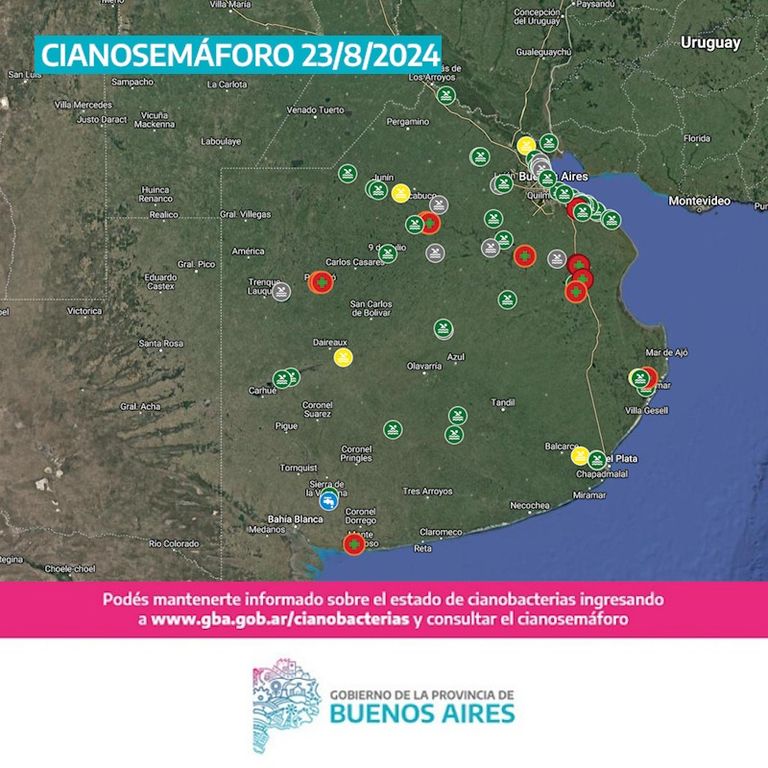 El cianosemáforo se puede consultar en gba.gob.ar/cianobacterias dónde también se encuentra el material descargable para difusión sobre qué son y cómo actuar ante su contacto.