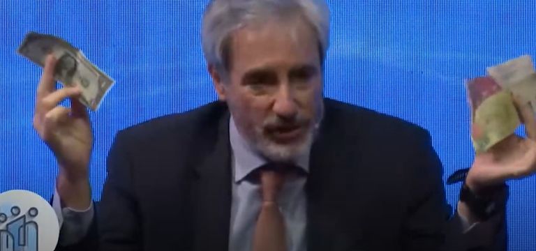 En la charla, Epstein un billete de un dólar y $ 700 pesos, haciendo la comparación en valor, de acuerdo a la cotización del dólar paralelo. Aseguró que los pesos son “papel pintado que nadie quiere”.
