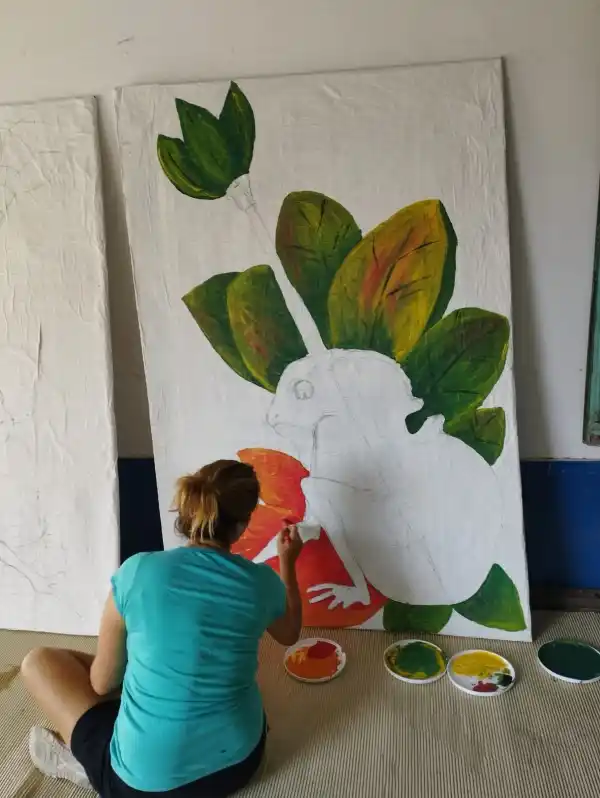 Se trata de los talleristas de artes plásticas Guillermina Tieri, Florencia Valdez, Vanesa Orué, Guillermina Helman y Mariano Moyano quienes pintan, en el taller de producción montado en la Vieja Estación, las diferentes estructuras artísticas que forman parte de la decoración que remite a la temática y al concepto de este corsódromo.