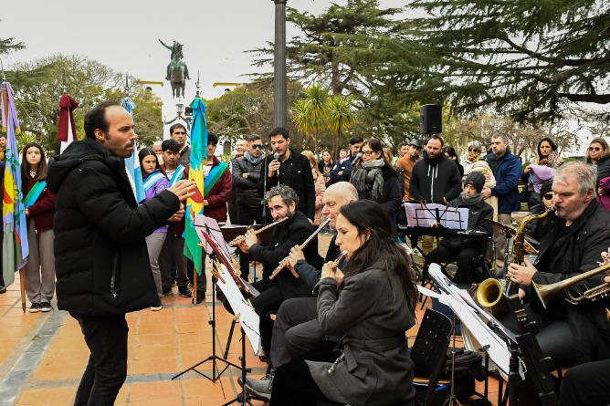 Al inicio, el Himno Nacional Argentino fue interpretado por la Banda Municipal “Profesor Jaime Lareau”, dirigida por el profesor Francisco Nápoli. Posteriormente, en honor a la memoria del Libertador, se realizó un minuto de silencio acompañado en trompeta por Lucas Valdez.