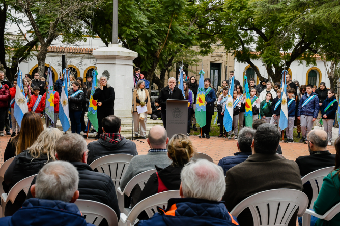 A lo largo del acto, además de abanderados y escoltas de escuelas e instituciones educativas, acompañaron autoridades municipales, educativas, judiciales y policiales, instituciones de la comunidad, docentes, delegaciones policiales, bomberos voluntarios, colectividades y vecinos y vecinas de la comunidad.