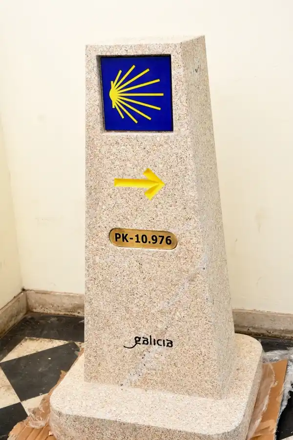 En su frente se puede ver una vieira amarilla sobre azulejo de color azul marino, esto nos indica, junto con la flecha amarilla la dirección a seguir, esencial para que el caminante sepa que va en la dirección correcta.