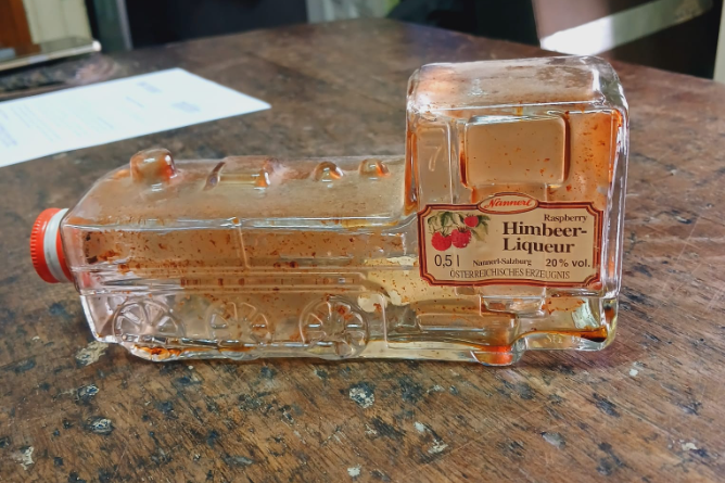 El otro objeto es una simpática botella de licor con forma de locomotora, pero en este caso proveniente de latitudes más lejanas ya que su etiqueta nos transporta a Salzburg, Austria.