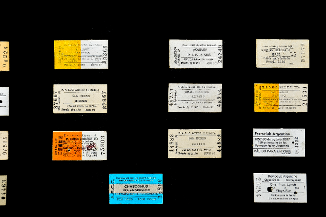 Como elemento adicional, esta muestra de boletos se exhibe en un antiguo cuadro de anuncio de novedades de la Unión Ferroviaria que fuera encontrado en una de las salas de encomiendas de la Estación y que luego de su restauración hoy puede apreciarse en el Museo Ferroviario.