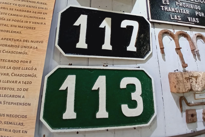 El Museo conserva tres ejemplares de estos carteles, el correspondiente al 113 era el más cercano de ellos a la Estación (la cual se encuentra en el km 113,780), el 107 en cercanías de ruta 20, y el 100 próximo a estación Gándara. Este último es un modelo más moderno fabricado en chapa y que seguramente reemplazó al original por rotura o sustracción.