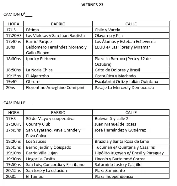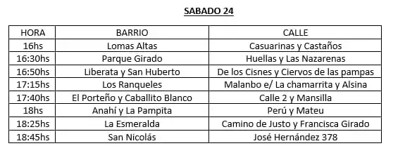 Este viernes estarían partiendo entre las 17hs, mientras que el sábado 24 del corriente mes “a las 16hs aproximadamente para recorrer los barrios ubicados en El Porteño y del otro lado de la laguna, siendo alrededor de nueve puntos”, enunció Vanzato.