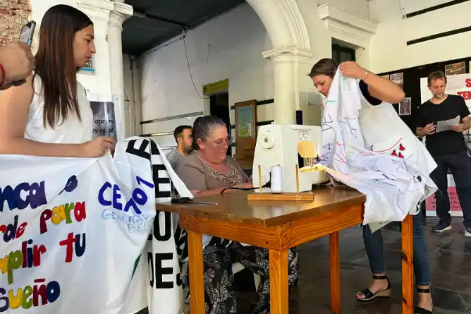 Además, los estudiantes presentaron una bandera confeccionada por ellos mismos, que será incorporada a otras banderas realizadas en distintos distritos de la provincia, como símbolo de la unidad y el compromiso de la educación para adultos en Buenos Aires.