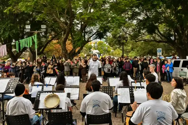 Frente a la catedral Nuestra Señora de la Merced, la Banda Sinfónica de la Orquesta-Escuela de Chascomús deleitó a los presentes con un concierto al aire libre.