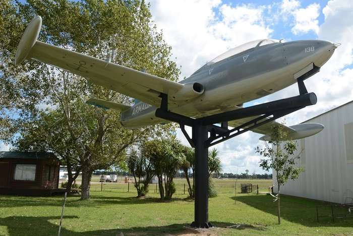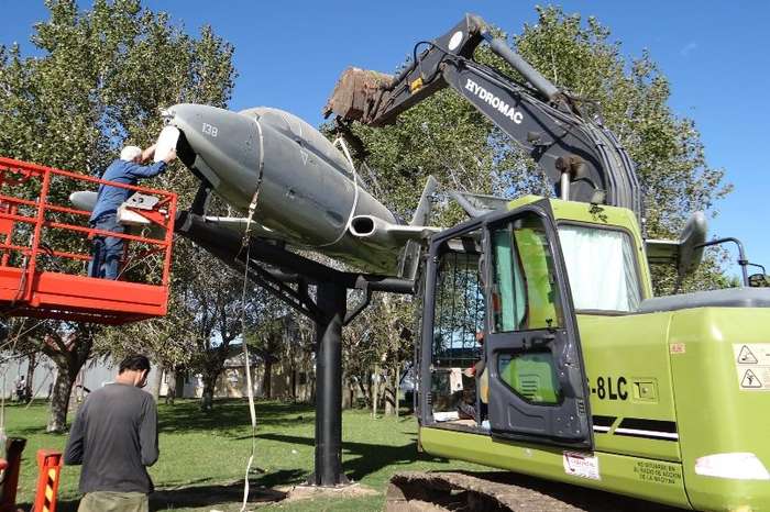 Se eligió la plaza del mismo, a manera de recibimiento y en enero de 2021 se construyó el cimiento del soporte de hierro. El mismo fue colocado en marzo y finalmente, después de muchas dificultades, los Veteranos de Malvinas concretaron el emplazamiento de la aeronave el 3 de abril.