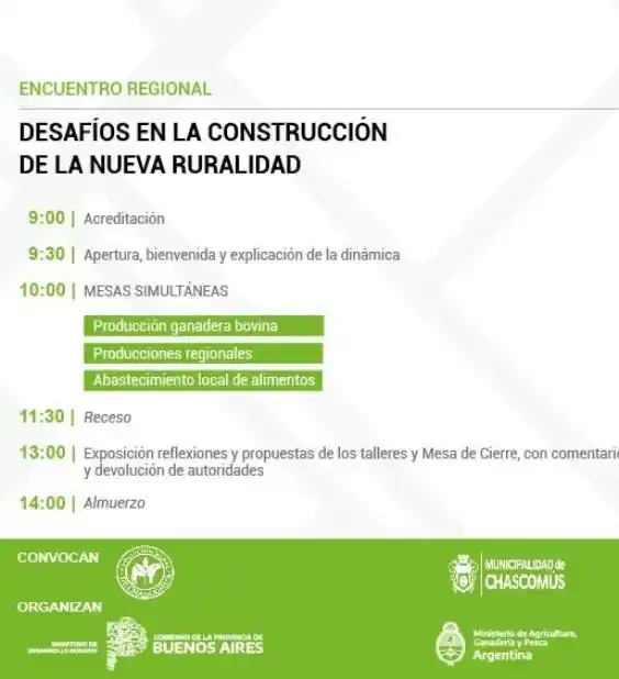 Al respecto, ayer desde la Secretaria de RRHH y Desarrollo Productivo de la Municipalidad de Chascomús recordaron que hoy, martes 19 de julio a las 09hs en la Asociación Rural de Chascomús, “se será la jornada denominada ‘Desafíos en la Construcción de la Nueva Ruralidad’, organizada en conjunto con el Ministerio de Agricultura, Ganadería y Pesca de la Nación y el Ministerio de Desarrollo Agrario de la Provincia de Buenos Aires”.