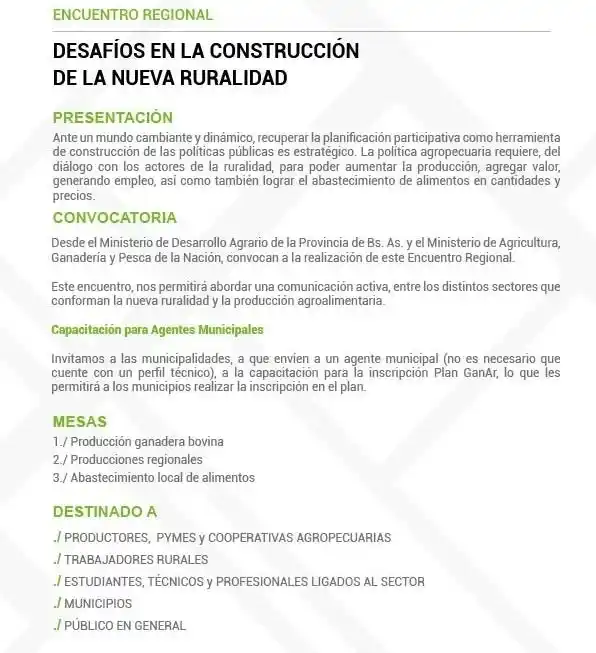 A través del Ministerio de Desarrollo Agrario de la Provincia de Buenos Aires y el Ministerio de Agricultura, Ganadería y Pesca de la Nación, convocaron a la realización de un Encuentro Regional para “abordar una comunicación activa entre los distintos sectores que conforman la nueva ruralidad y la producción agroalimentaria”.