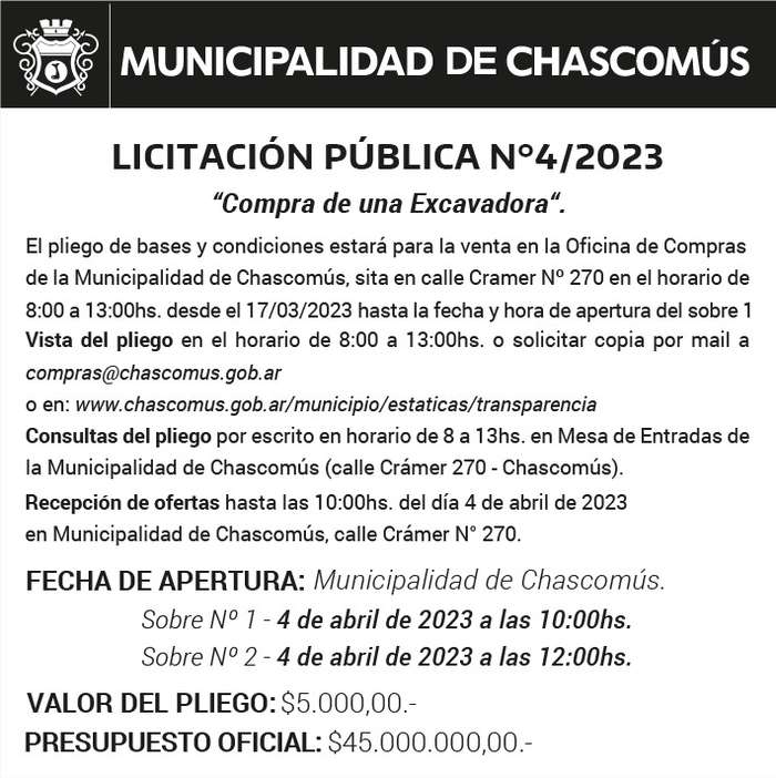 Los pliegos estarán disponibles para la venta, con un valor de 5 mil pesos, en la Oficina de Compras Municipal (Crámer 270), en el horario de 8 a 13. También se podrá solicitar una copia al mail compras@chascomus.gob.ar o por escrito en el horario de 8 a 13 en la Mesa de Entradas de la Municipalidad.