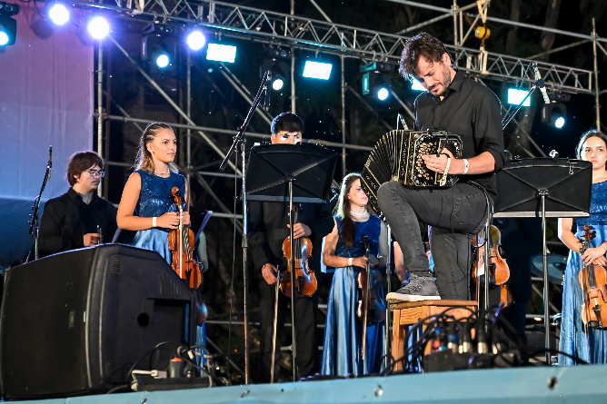 La Filarmónica de Chascomús, con Rafael Gintoli y Nico Sorín como invitados, repasó, en el Parque de los Libres del Sur, parte del repertorio del genial Astor Piazzola ante una multitud en el inicio de la edición 20° aniversario de la Fiesta Federal de las Orquestas Infantiles y Juveniles.