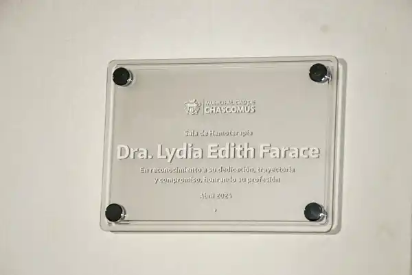 El acto culminó con un cerrado aplauso, al descubrir la placa el intendente municipal acompañado por el esposo de la doctora Farace, Pastor Luis Romano y su hija Alba; la secretaria de Salud Pública, Marcela Arias; el director del Hospital Municipal, Dr. Diego Prat, y la jefa de Hemoterapia y banco de Sangre, Dra. Cecilia Berman. La placa versa: “Sala de Hemoterapia Dra. Lydia Edith Farace, en reconocimiento a su dedicación, trayectoria y compromiso, honrando su profesión”.
