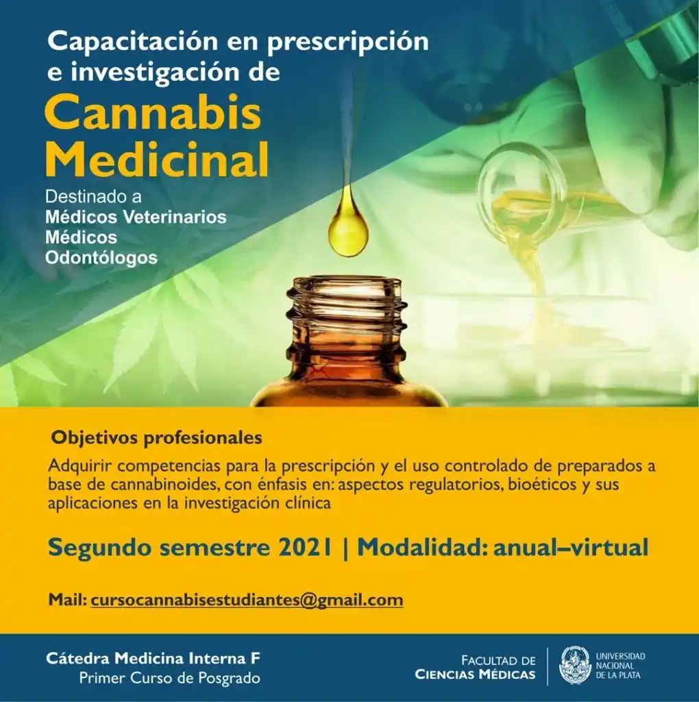 La Facultad de Ciencias Médicas de la Universidad Nacional de La Plata (UNLP) dictará el primer curso de posgrado en Prescripción e Investigación de Cannabis Medicinal, se informó oficialmente. La propuesta está destinada a médicos, veterinarios y odontólogos, y abordará la temática incluyendo los aspectos éticos, legales y académicos.