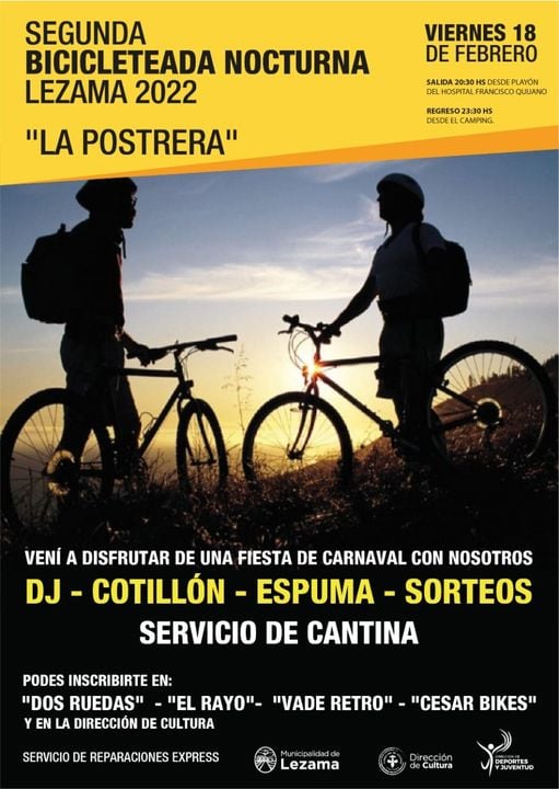 La Dirección de Cultura y Relaciones Institucionales y la Dirección de Deportes y Juventud de Lezama informan que está abierta la inscripción para ser parte de la Segunda Bicicleteada nocturna a La Postrera.