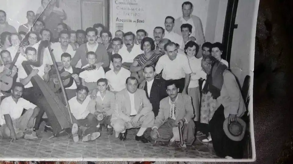 En la foto aparece Raúl Alfonsín junto a otros correligionarios en la inauguración de la Casa Radical donde se puede advertir la presencia de un cartel pegado sobre la pared que dice “Correligionario colabore con el partido. Adquiera un bono”. Y resulta también llamativa la presencia de algunos músicos con Arpa y Guitarras que se ocuparon ese día de animar el acto partidario. Aparecen junto a Alfonsín Eduardo Greco, Dante Greco y esposa, Perla Goñi, Juan Pedro Urruti, Alicia Alfonsín y Juan Pintos, entre otros.