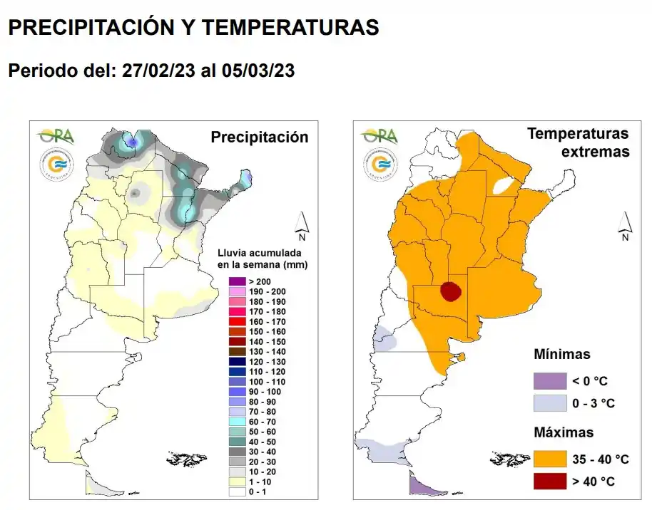 Cabe mencionar que, según el informe semanal de eventos meteorológicos de la Mesa Nacional de Monitoreo de Sequias del mes de marzo, desde el período del 27 de febrero al 5 del corriente mes, las temperaturas máximas rondaron entre los 35 a 40º C en la Provincia de Buenos Aires, en tanto que las precipitaciones variaron en diferentes zonas con lluvia acumulada en la semana de entre 0 milímetros a 30 mm. En el mientras tanto, para mitad de esta semana, se aguardan precipitaciones.