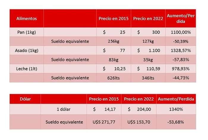 Tal vez entendamos mejor si vemos para que alcanzaba el sueldo de un trabajador Municipal de 40 hs semanales que en 2015 cobraba SEIS MI CUATROCIENTOS QUINCE pesos ($ 6.415) y lo comparamos con lo que actualmente percibe TREINTA OCHO MIL TRESCIENTOS CINCUENTA Y TRES pesos ($ 38.353) tenemos por ejemplo: (mirá el segundo cuadro con las comparaciones).