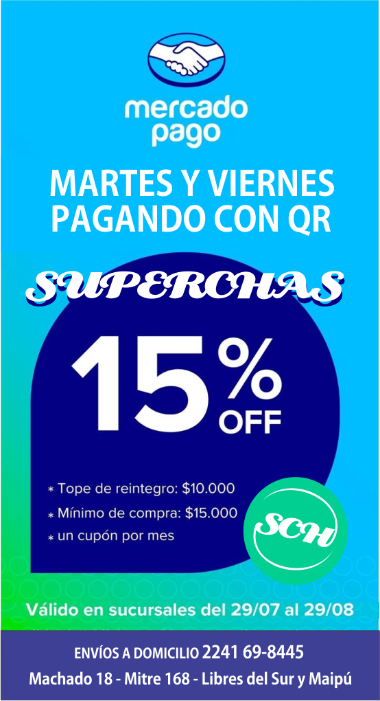 SUPERCHAS ofrece un 15% de descuento en tus compras pagando con código QR de Mercado Pago. Esta promoción estará vigente todos los martes y viernes, desde el 29 de julio hasta el 29 de agosto. El beneficio tiene un tope de reintegro de $10.000 y la compra mínima para acceder es de $15.000. Cada cliente puede utilizar un cupón por mes.