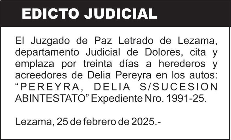 El Juzgado de Paz Letrado de Lezama, departamento Judicial de Dolores, cita y emplaza por treinta días a herederos y acreedores de Delia Pereyra en los autos: “PEREYRA, DELIA S/SUCESION ABINTESTATO” Expediente Nro. 1991-25.