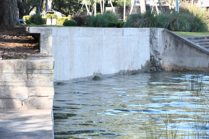Además de los escalones, la obra incorpora una defensa de contención sobre el lecho de la laguna, ubicada estratégicamente antes de las escalinatas. Esta estructura funciona como una medida de protección fundamental ante posibles crecimientos de las aguas, garantizando mayor seguridad y durabilidad a la infraestructura.