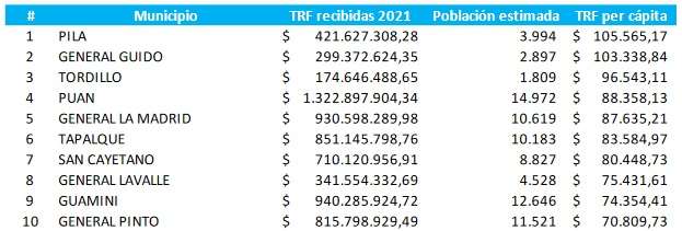 Los grandes beneficiarios en la medición de recursos recibidos por habitante fueron municipios del interior escasamente habitados. Pila, con una población estimada en 4 mil y más de $ 421 millones recibidos por transferencias bonaerenses, lideró la tabla con $ 105.565 per cápita (casi 13 veces más que La Matanza).