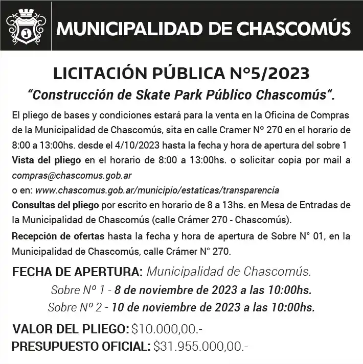 Se abre la convocatoria para interesados en la Licitación Pública N°05/2023 “Construcción de Skate Park Público Chascomús”. La obra tiene un presupuesto oficial de 31.955.000 pesos.