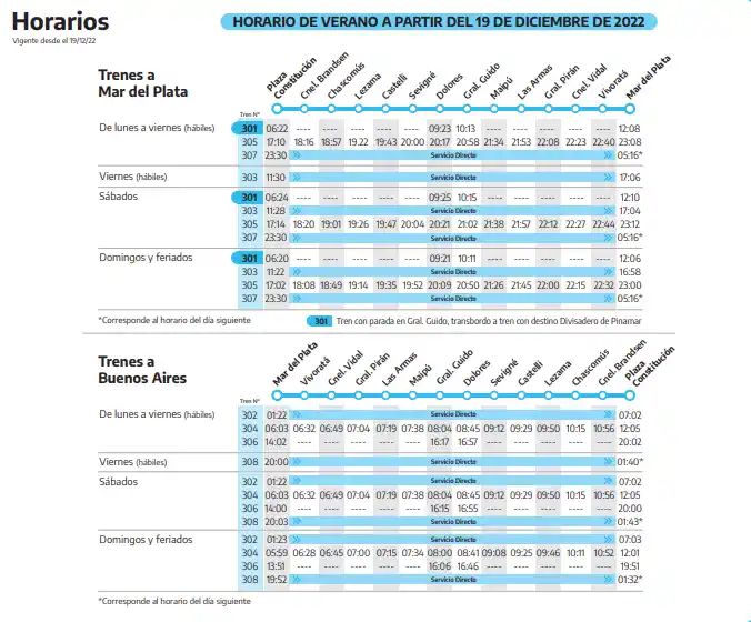 Desde Constitución parten a las 6.22 (paradas en Dolores y General Guido para la combinación a Pinamar); a las 17.10 (parando en las 12 intermedias); a las 23.30 (directo) y a las 11.30 viernes, sábados y domingos (directo).