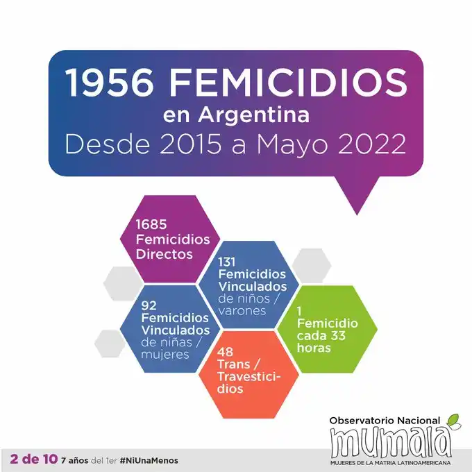 Por su parte, desde el Observatorio Nacional de Mujeres de la Matria Latinoamericana (MuMaLá) contabilizaron, según datos relevados en medios de comunicación, un total 1.956 femicidios desde el 2015 a mayo 2022, siendo 1.685 femicidios directos, 131 femicidio vinculados de niños/varones, 92, femicidios vinculados de niñas/mujeres, 48 trans/travesticidios, produciéndose un femicidio cada 33 horas.