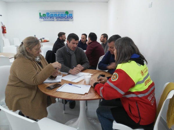 Se trata de un trabajo en equipo coordinado por la Dirección de Defensa Civil y los referentes de las distintas áreas municipales, realizado en las instalaciones de la Asociación Bancaria.