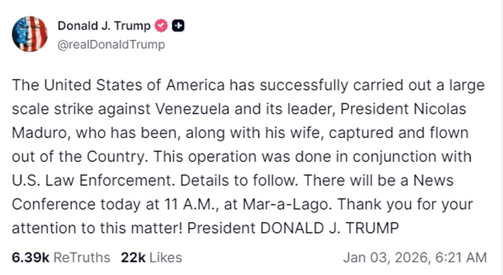 En su publicación realizada en su propia red, Truth Social, Trump afirmó que “los Estados Unidos de América llevaron a cabo con éxito un ataque a gran escala contra Venezuela y su líder, el presidente Nicolás Maduro”, y precisó que el mandatario venezolano “fue, junto con su esposa, capturado y trasladado fuera del país”.